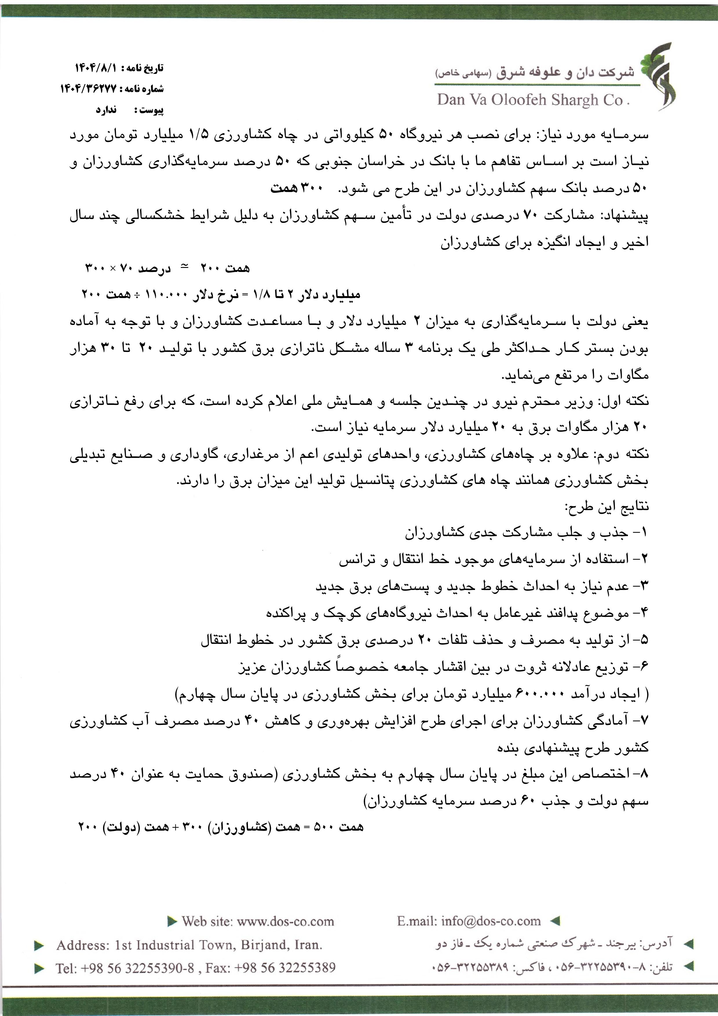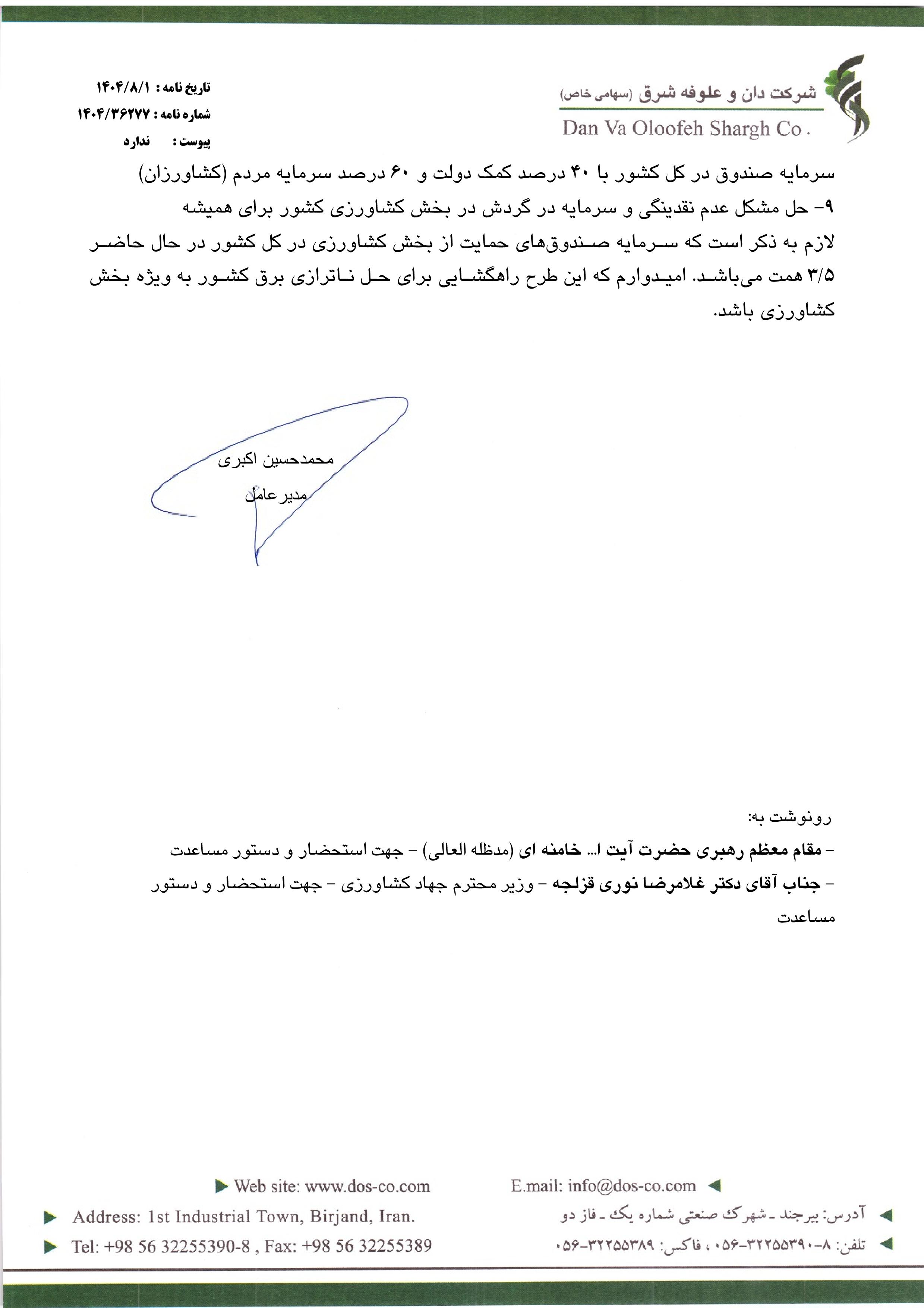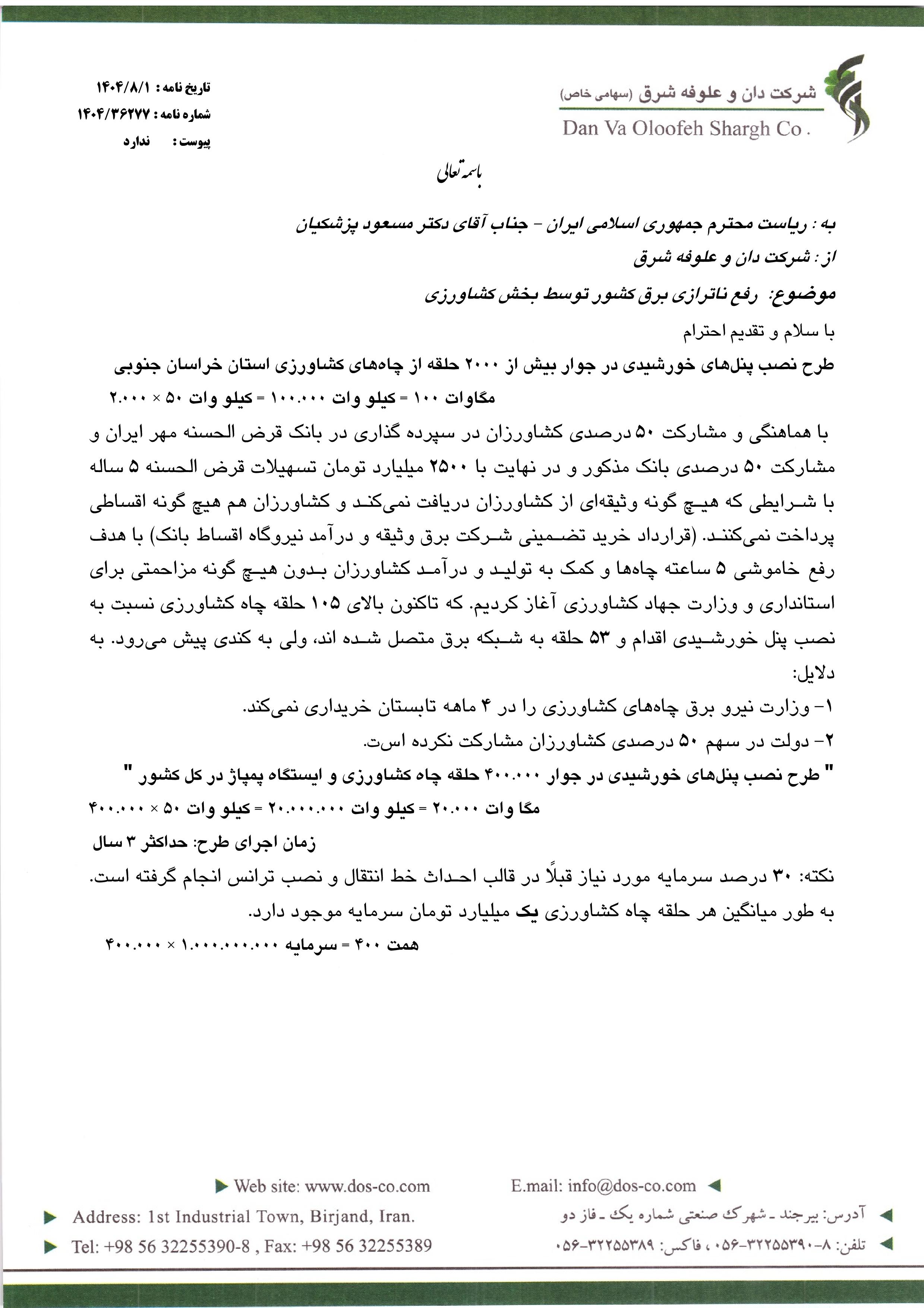 نوبیک - محمدحسین اکبری مدیر عامل شرکت دان و علوفه شرق طی نامه ای به رییس محترم جمهور ، دکتر پزشکیان ، راه حل پیشنهادی خود را جهت رفع ناترازی برق در کشور ارائه دادند.